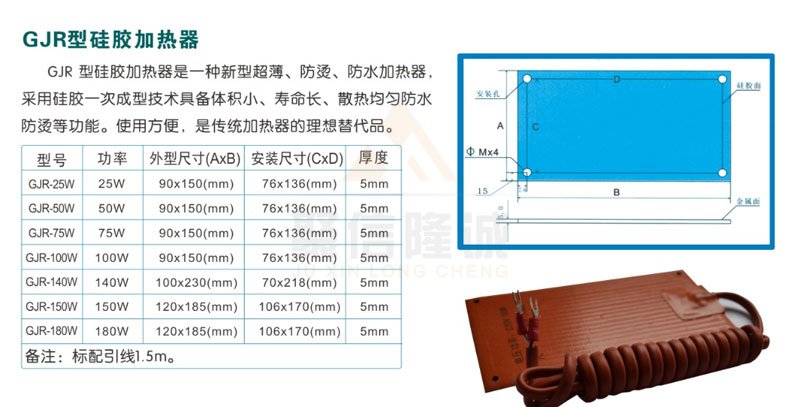 硅橡膠加熱器(SCS) 英譯:Silicone Rubber Heaters 又稱:硅橡膠加熱帶,硅橡膠加熱片,硅橡膠加熱板,硅橡膠加熱膜,主要是由鎳鉻合金電熱絲和硅橡膠高溫絕緣布組成。它發(fā)熱快、溫度均勻、熱效率高、強度高、使用方便、安 全壽命長達四年,不易老化。硅橡膠電熱帶等硅橡膠加熱器主要是由鎳鉻合金電熱絲和硅橡膠高溫絕緣層組成。硅橡膠高溫絕緣層是由硅橡膠與玻璃纖維布復(fù)合而成的薄片狀(標(biāo)準(zhǔn)厚度為1.5mm),硅橡膠加熱器具有很好的柔軟性。